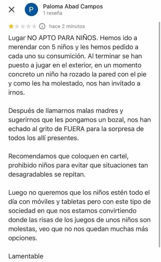 Una de las clientas había compartido en la reseña del lugar que debían aclarar que se trataba de un espacio "NO APTO PARA NIÑOS". Habían ido a merendar con cinco pequeños, y éste fue su relato original: "Al terminar se han puesto a jugar en el exterior, en un momento concreto un niño ha rozado la pared con el pie y como les ha molestado, nos han invitado a irnos", publicó Paloma Abad Campos.