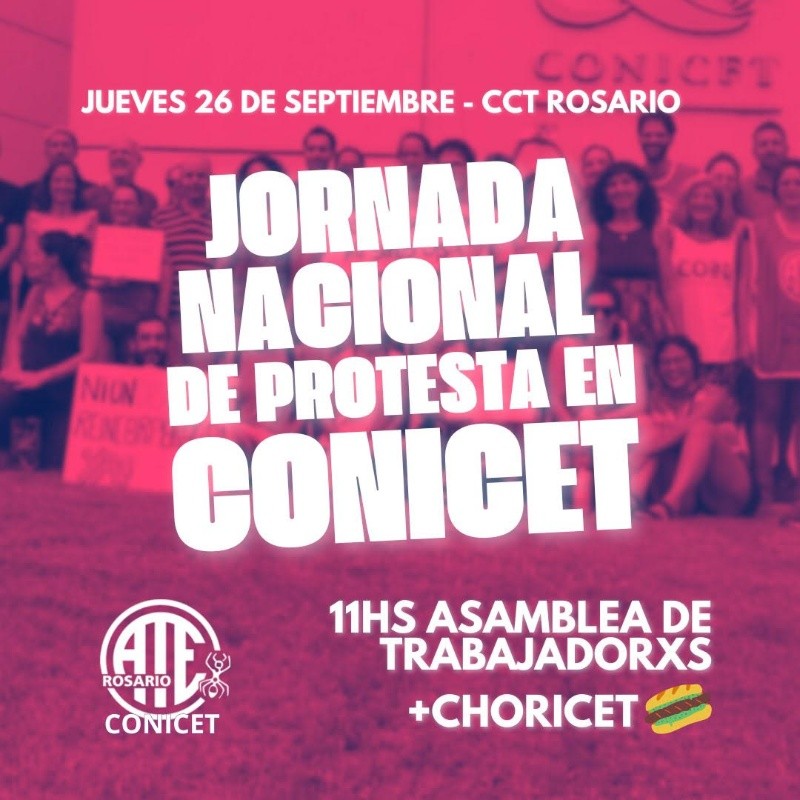 En ese marco, desde el Conicet Rosario llamaron a una “Asamblea de Trabajadores de Conicet desde las 11 y, posteriormente, a una choripaneada en la explanada del CCT de Rosario (Ocampo y Esmeralda)”.