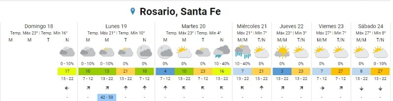 El SMN anuncia además que pasadas las tormentas, el lunes continuará mayormente nublado con descenso de los registros térmicos: la mínima iniciará en 7 grados y la máxima llegará a 20 por la tarde. Para el resto de la semana el cielo se irá despejando, y las máximas en aumento.
