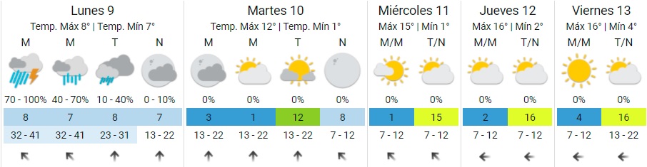 Las lluvias continuarían este lunes y se espera una temperatura mínima de 7 grados, no tan baja pero sin variación térmica durante el día, con máxima prevista en 8º. El martes sí vuelve el invierno: apenas 1 grado por la mañana y mucho frío durante casi toda la semana.