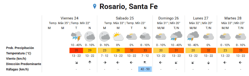 El sábado iniciaría con una temperatura mínima de 23 grados y con el correr de las horas volvería el calor: se espera una máxima de 33 grados. Para el domingo, el SMN señala una amplitud térmica de 20 a 31.