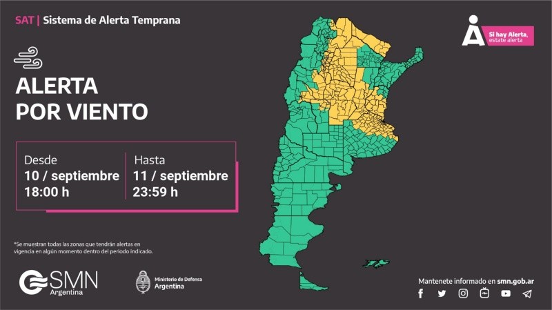 Por otro lado, se anuncian vientos del sector sur con velocidades entre 40 y 60 km/h y ráfagas que pueden alcanzar los 75 km/h.