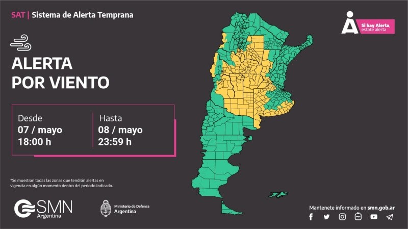 El Servicio Meteorológico Nacional (SMN) emitió un alerta amarillo por vientos fuertes que abarca a Rosario y a una amplia zona del país durante la madrugada de este miércoles 8.
