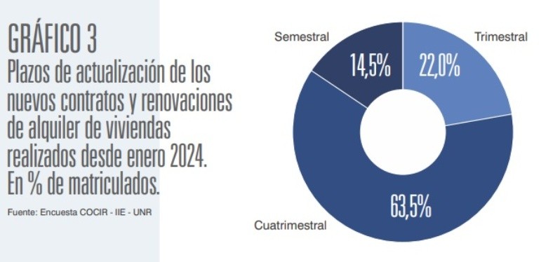 En cuanto al plazo de actualización de los contratos, tanto de los nuevos como de las renovaciones hechas en 2024 poco más del 63% de los matriculados manifestó que fueron pautados de manera cuatrimestral.