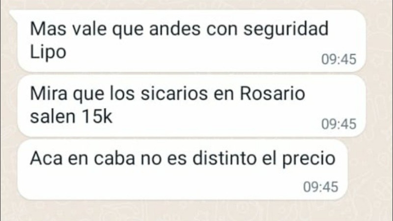 En los mensajes que mostró, la persona que le escribe le dice: "Más vale que andes con seguridad, Lipo. Mirá que los sicarios en Rosario salen 15K (sic). Acá, en CABA, no es distinto el precio".