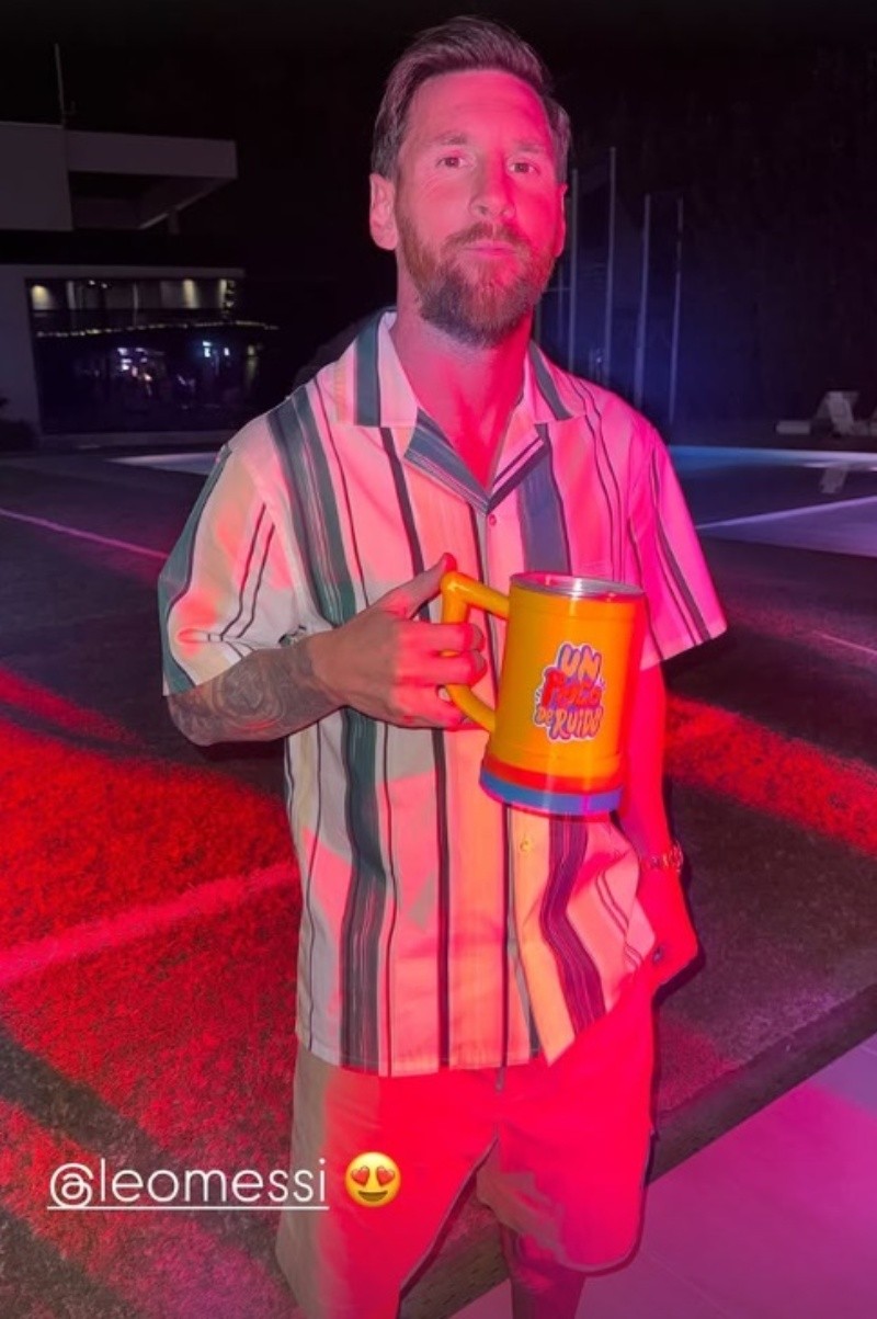 En las imágenes se los puede ver en una pose romántica con besos y sonrisas. Y también se lo ve a Leo tomando en un vaso de chopp multicolor con la frase “un poco de ruido”, que pertecene a un canal de streaming.