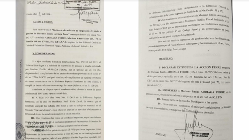 Arriaga Ferré finalmente obtuvo la probation –es decir, le suspendieron el juicio a prueba– y el Tribunal Oral en lo Criminal de Tierra del Fuego le extinguió la pena luego de cumplir un año de tareas comunitarias y del pago de una multa.