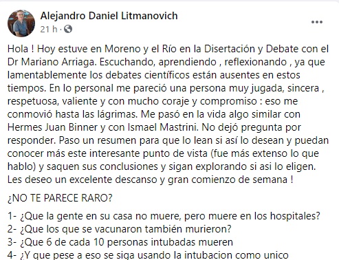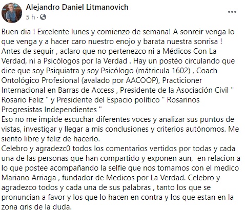 El referente de la organización Médicos por la Verdad es Mariano Arriaga, quien convoca a rebelarse contra el covid y dio algunas definiciones publicadas en una nota del periodista Roberto Caferra en Rosario3. Dijo: “Somos médicos por la verdad y la justicia, y somos también la organización mundial por la vida. Salimos a recorrer el país generando debates plaza por plaza. Vamos a estar en el Monumento a la Bandera con un grupo de colegas generando un debate público científico médico, para intentar comprender el estado de la situación que vivimos, que desde nuestro punto de vista, acá no hay una pandemia que justifique este encierro”. De acuerdo a información del programa Telenoche Rosario (El Tres) Mariano Arriaga estuvo procesado en 2011 en una causa de estafa contra la Dirección de Bienestar de la Armada (DIBA), la obra social de la Armada Argentina. En 2012 El Diario del Fin del Mundo -medio fueguino- publicó que se lo acusó de haber fingido una operación de glaucoma a un paciente en el hospital de la capital fueguina. Uno de los asistentes a la actividad del domingo en el parque de las Colectividades es el psicólogo rosarino Alejandro Litmanovich quien informa en sus redes sociales que se desempeña como coordinador en la Municipalidad de Rosario, fue precandidato y manifestó su aval a listas del Frente Progresista. Además es presidente del espacio político denominado "Rosarinos Progresistas Independientes” que se referencia en políticos como Hermes Binner y Miguel Lifschitz, a quien Litmanovich destacó sin mencionar su fallecimiento por covid-19. Aunque el psicólogo aclaró que no forma parte de Médicos por la verdad ni Psicólogos por la verdad contó que participó de la exposición de Arriaga. “Escuchando, aprendiendo, reflexionando, ya que lamentablemente los debates científicos están ausentes en estos tiempos”, expresó. Luego comparó al referente de la organización Médicos por la Verdad con el ex gobernador de la provincia Hermes Binner. “(Arriaga) en lo personal me pareció una persona muy jugada, sincera , respetuosa, valiente y con mucho coraje y compromiso: eso me conmovió hasta las lágrimas. Me pasó en la vida algo similar con Hermes Juan Binner y con Ismael Mastrini. No dejó pregunta por responder”, posteó el psicólogo en Facebook el domingo. Tras la repercusión de su presencia, este lunes Litmanovich expresó: “A sonreir venga lo que venga y a hacer caro nuestro enojo y barata nuestra sonrisa! Antes de seguir, aclaro que no pertenezco ni a Médicos Con La Verdad, ni a Psicólogos por la Verdad . Hay un postéo circulando que dice que soy Psiquiatra y soy Psicólogo (mátricula 1602) , Coach Ontológico Profesional (avalado por AACOOP), Practicioner Internacional en Barras de Access , Presidente de la Asociación Civil " Rosario Feliz " y Presidente del Espacio político "Rosarinos Progresistas Independientes”. Celebro y agradezco todos los comentarios vertidos por todas y cada una de las personas que han compartido y exponen aun, en relación a lo que postee acompañando la selfie que nos tomamos con el medico Mariano Arriaga, fundador de Médicos por La Verdad. Celebro y agradezco todos y cada una de sus palabras , tanto los que se pronuncian a favor y los que lo hacen en contra y los que están en la zona gris de la duda”, justificó. Más información