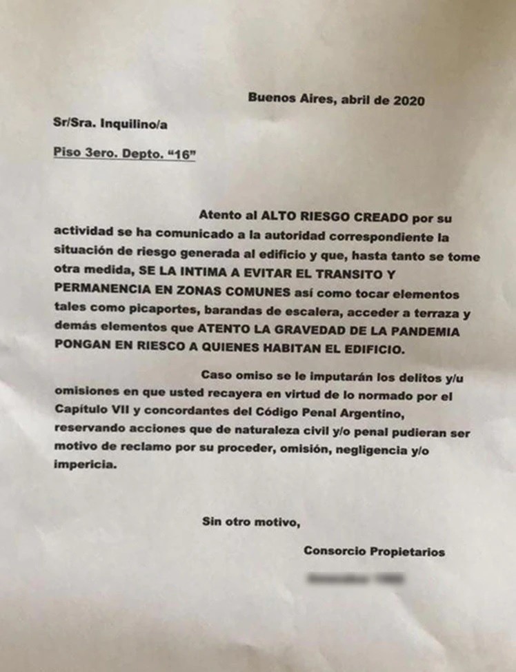 "Atento a su alto riesgo creado por su actividad se ha comunicado a la autoridad correspondiente la situación de riesgo generada en el edificio y que, hasta tanto se tome otra medida, se intima a evitar el tránsito y permanencia en zonas comunes así como tocar elementos tales como picaportes, barandas de la escalera, acceder a terraza y demás elementos atento a la gravedad de la pandemia", dice la nota que recibió una médica que vive en el tercer piso de un edificio del barrio porteño de Colegiales.