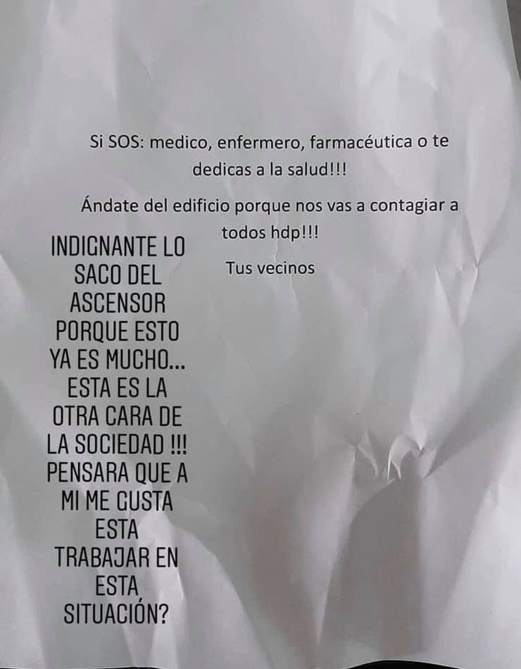 En tanto, en otro edificio de la ciudad de Buenos Aires pero en el barrio de Villa Crespo, un farmacéutico se indignó al ver un cartel similar pegado en el ascensor: “Si sos médico, enfermero, farmacéutica o te dedicás a la salud, andate del edificio que nos vas a contagiar a todos hdp. Tus vecinos", leyó Fernando Gaitán y compartió su bronca en internet.