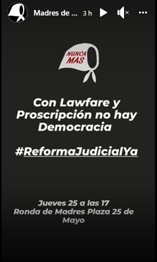 Las convocatorias, realizadas por medio de las redes sociales, plantean "no al lawfare, reforma judicial, democratización de la Justicia y libertad a todas las presas y presos políticos".