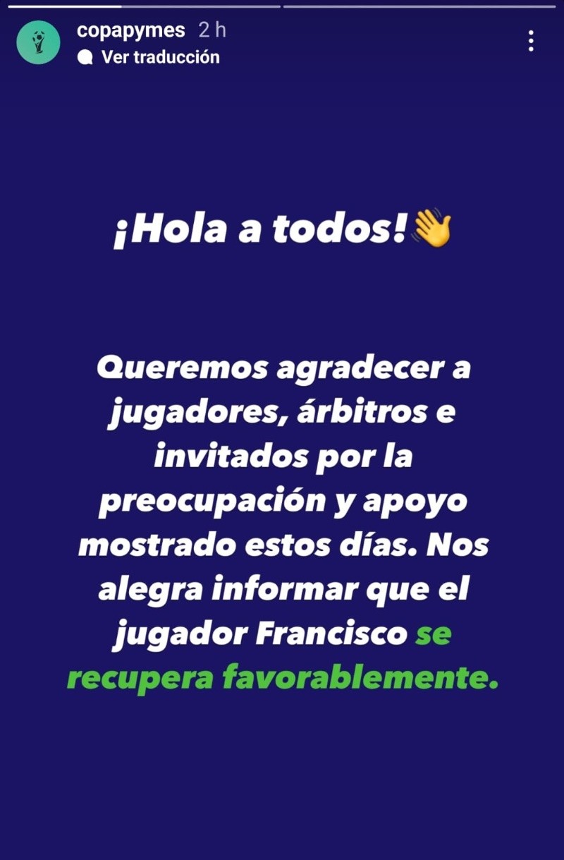 Según detallaron desde la Copa Pymes, el jugador llegó “estabilizado” al Sanatorio GO y posteriormente fue trasladado al Sanatorio Parque de Rosario, donde este lunes continúa internado y “estable”.