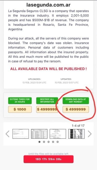 Tras filtrar 17 documentos el domingo 26, LockBit posteo en su sitio web que: “Durante nuestro ataque, todos los servidores de esta empresa fueron bloqueados. La data de la compañía fue robada. Información del seguro. Datos personales de los clientes, incluidos los pasaportes. Toda la información sobre la propiedad asegurada. Todo esto y mucho más (más de 100.000 archivos) se publicarán al público en caso de negativa a pagar el rescate”.