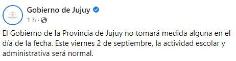 En el caso de Jujuy, la comunicación de la disidencia con lo dispuesto por el gobierno nacional fue más escueta. A través de su cuenta oficial de Facebook, el gobierno que comanda Gerardo Morales daba a conocer que “este viernes 2 de septiembre la actividad escolar y administrativa será normal”.