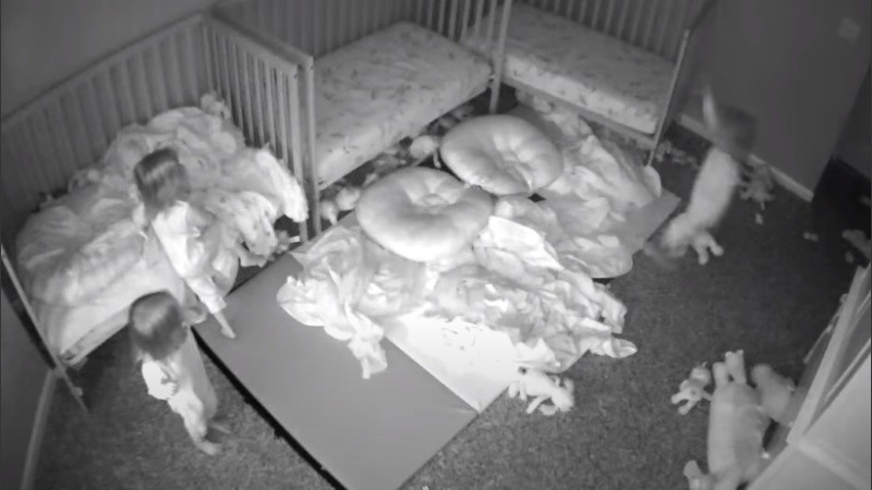 Una cámara instalada en la habitación de unas trillizas capturó la escalofriante escena en la que las pequeñas de dos años parecen “hablar. con figura invisible que se encuentra en una de las paredes.