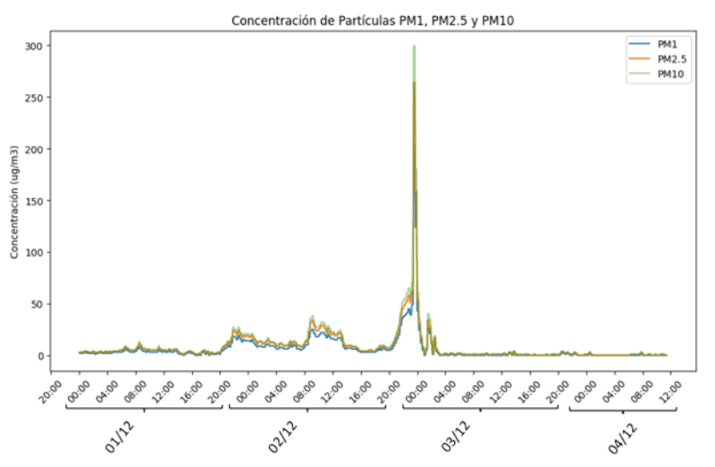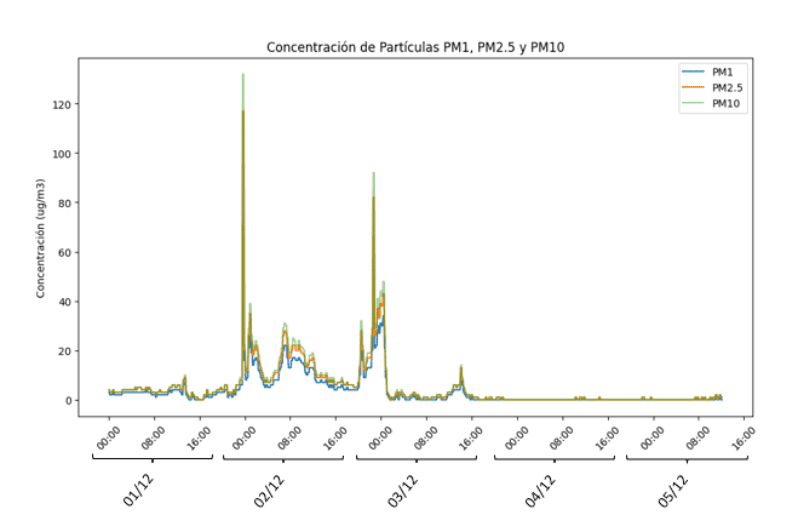 Asimismo, se presentan las gráficas de las concentraciones detectadas en función del tiempo, donde se ve que los días en que se produce un aumento apreciable en los niveles de particulado atmosférico, se extienden desde el final del viernes 1 de diciembre hasta el comienzo del domingo 3 de diciembre, es decir, coincide con el fin de semana donde se reportó el mal olor, si bien el mismo continuó percibiéndose el domingo y el lunes.