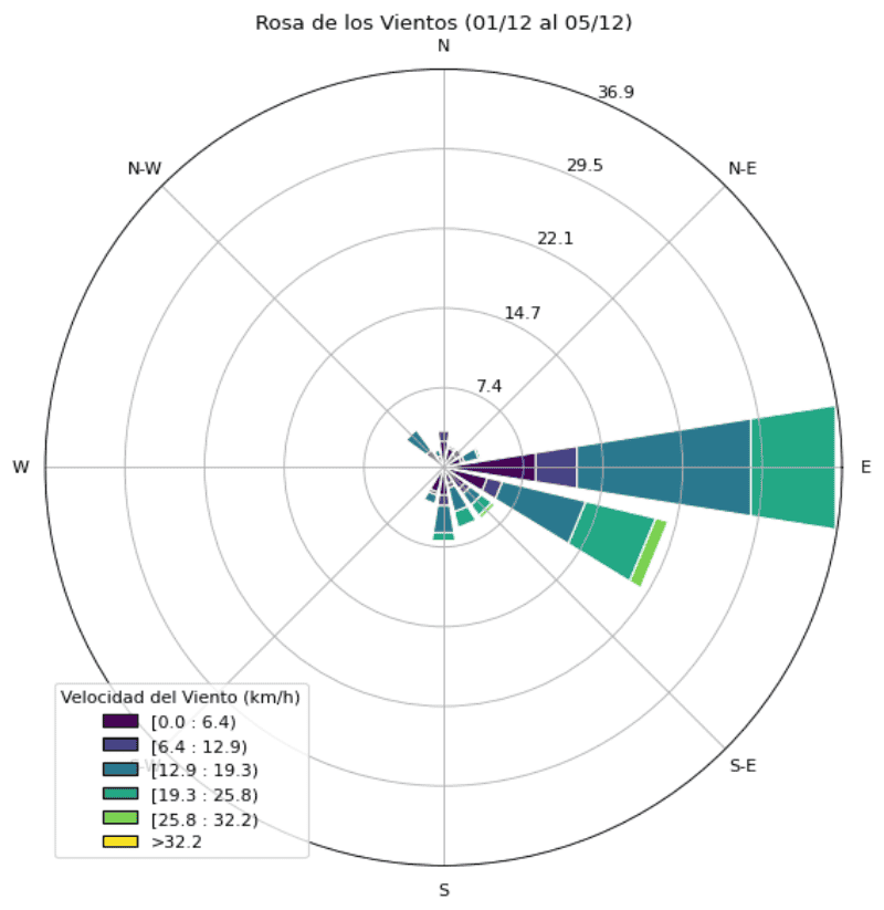 La dirección del viento predominante para el periodo en el que se registró mal olor es el este seguido por ESE. Es decir, los vientos provinieron desde la dirección del río Paraná. Los datos fueron obtenidos de la estación meteorológica Davis ubicada en el Instituto de Física de Rosario (32.97° S, 60.624° O).