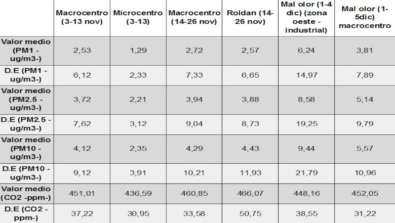 A continuación, se presenta un tabla con los resultados de los valores medios de las mediciones de las concentraciones del material particulado en sus fracciones PM1, PM2.5 y PM10 y del gas dióxido de carbono (CO2) y sus desviaciones estándar, en distintos sitios del Gran Rosario, antes y durante el período de mal olor.