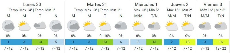 De acuerdo a la cartilla oficial, para la tarde del lunes se pronostica una temperatura máxima de 14 grados. El martes muy similar: termómetro entre 1º y 13º.