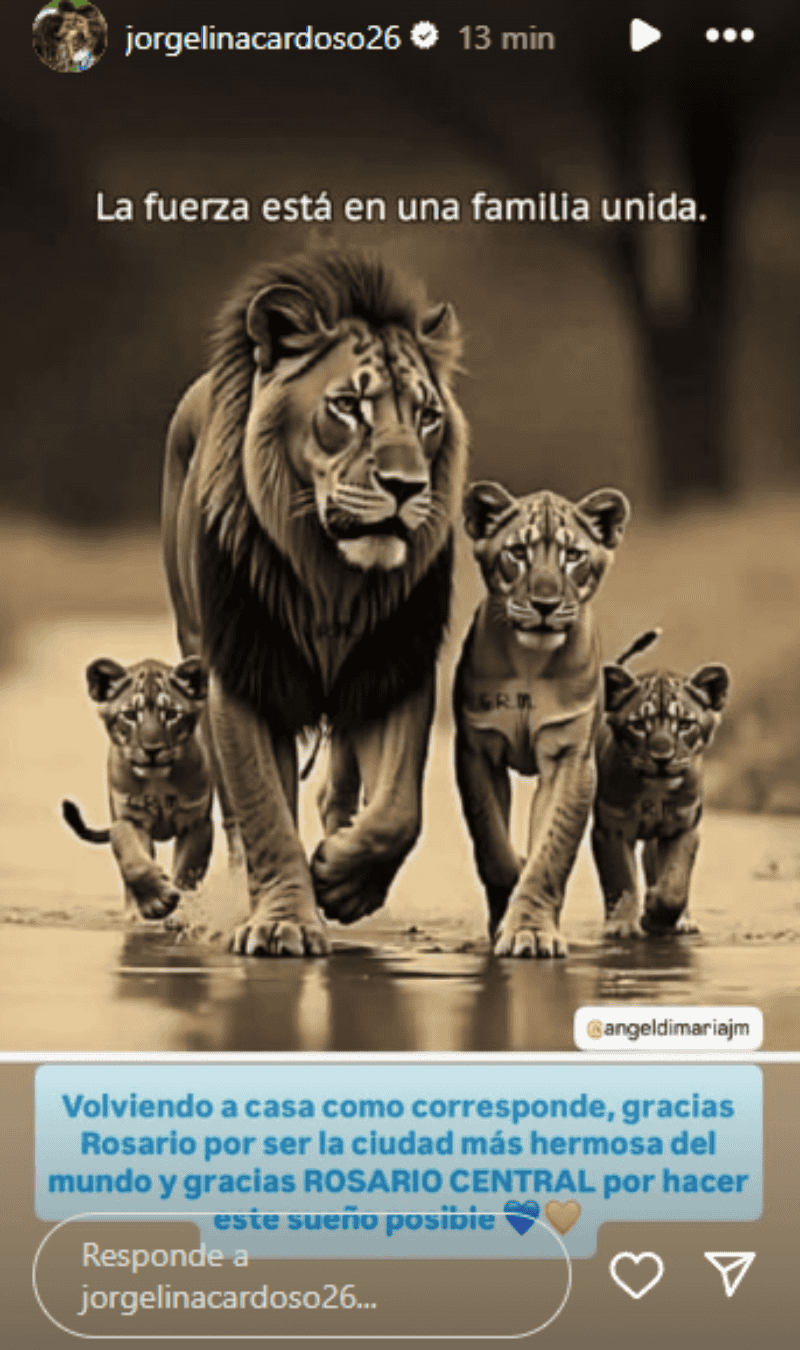 "Volviendo a casa, como corresponde", señaló minutos después junto a una foto de un león, una leona y sus crias. "Gracias Rosario, por ser la ciudad más hermosa del mundo. Gracias Rosario Central, por hacer este sueño posible", cerró.