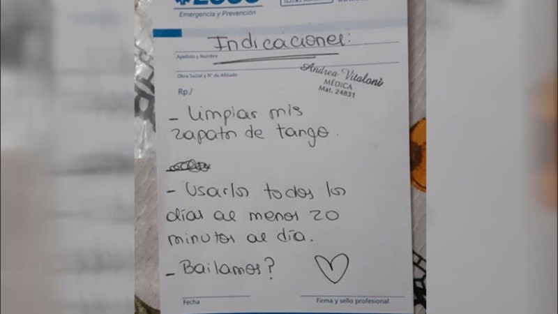La médica rafaelina Andrea Vitaloni anotó en las indicaciones, donde se suele escribir los medicamentos o los tratamientos que necesita un paciente, unos emotivos mensajes: "Limpie sus zapatos (de tango) y que los use al menos 20 minutos por día".