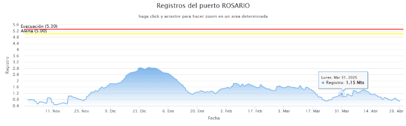 El Instituto Nacional del Agua (INA) detalló en un informe que en Rosario se espera para el próximo 6 de mayo que el nivel de las aguas oscilen entre los 40 centímetros y 1,20 metros. El INA indicó que la tendencia para los próximos días será de "aguas bajas", con un comportamiento de descenso en los valores semanales o una eventual estabilización.