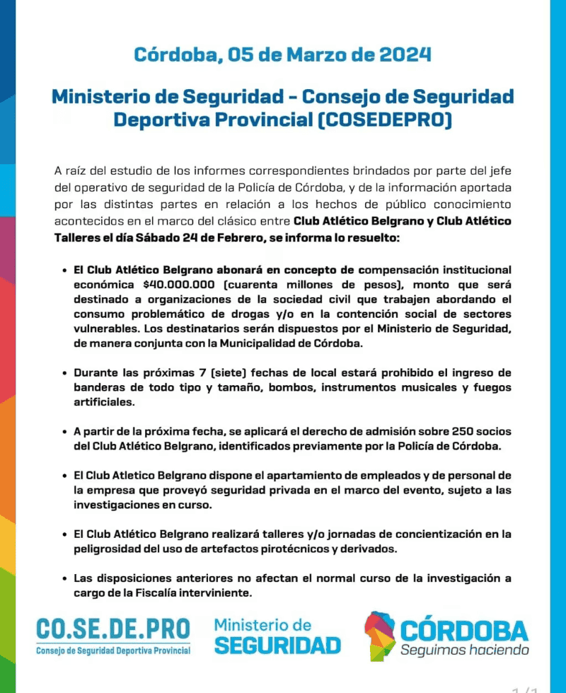 El Ministerio de Seguridad de la Provincia de Córdoba, conjuntamente con el Cosedepro (Consejo de Seguridad Deportiva Provincial), dieron a conocer este martes al mediodía la sanción aplicada al club Belgrano por el lanzamiento de fuegos artificiales durante el clásico con Talleres que derivó en la suspensión momentánea del juego.