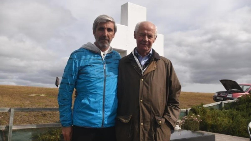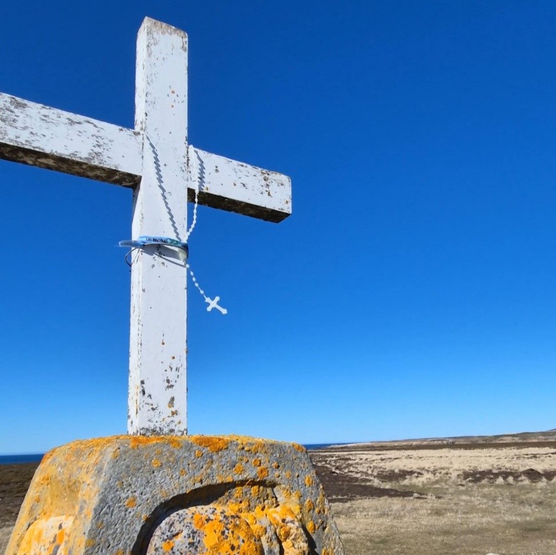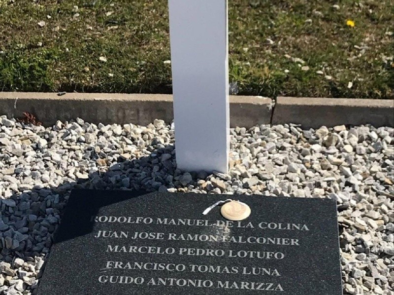 “Acá yacen los restos de aviadores argentinos solo conocidos por Dios”, se lee –en inglés– sobre la placa de metal colocada en el monolito piramidal de piedra y coronado por una cruz que separa las dos tumbas. Se presume, por el hallazgo que hicieron los británicos doce años después del final de la guerra de Malvinas, que corresponden a dos de los cinco tripulantes del avión LearJet 35 T-24 en el que iban Juan José Falconier, Guido Marizza, Marcelo Lotufo, Francisco Luna y Rodolfo De la Colina, cuando fue derribado por los ingleses el 7 de junio de 1982. Es la única sepultura de soldados argentinos fuera del Cementerio de Darwin, donde estos cinco nombres tienen además una tumba común y en el que fueron enterrados en total 237 compatriotas