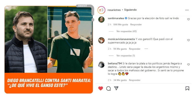 En el medio de chicanas que van y vienen, Maratea bromeó dejando su comentario en el posteo de Instagram de @rosariotres. "Gracias por la elección de la foto, salí re lindo" agradeció.