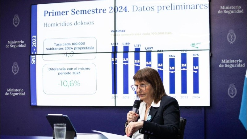 "La baja del 10.6% de los homicidios nos marcan una baja del más de 100 vidas en el semestre. Es un número muy apreciable", resaltó Bullrich y señaló la importancia de la utilización de armas no letales, como las pistolas tasers en situaciones de ataques con cuchillos o armas blancas.