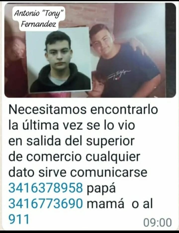 Antonio "Tony" Fernández tiene 17 años, estudia en el Superior de Comercio y desde este viernes al mediodía su familia lo está buscando por toda la ciudad.