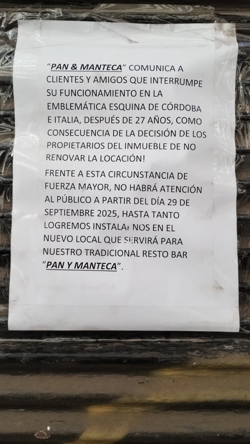 Una esquina tradicional de Rosario es la que cruza, en pleno Paseo del Siglo, las calles Córdoba e Italia. Allí, en un edificio antiguo, de elegantes y soberbias formas, funcionaba hasta hoy el restobar Pan y Manteca. Este lunes, el comercio fue desmantelado y en su puerta se exhibía un cartel en el que se explica las razones del cierre.