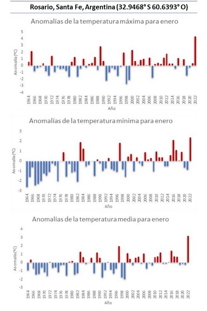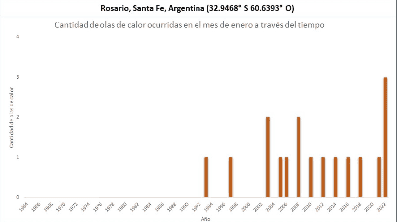 Según datos de la estación meteorológica Rosario Aero (SMN) y del satélite Merra 2 (Nasa), enero de 2022 fue récord desde los registros de 1964. Hubo tres olas de calor ese mes, que es cuando las temperaturas máxima y mínima se mantienen por encima de los valores límite durante al menos tres días seguidos.