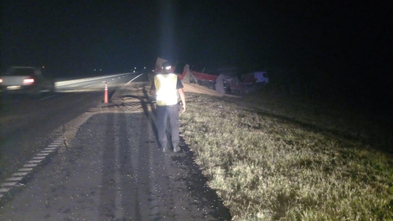 El vuelco se produjo en el kilómetro 98 de la autopista, a la altura de la localidad de Arocena. El camión trasladaba soja que afortunadamente cayó sobre la banquina por lo que no se afectó la circulación y tampoco a terceros.