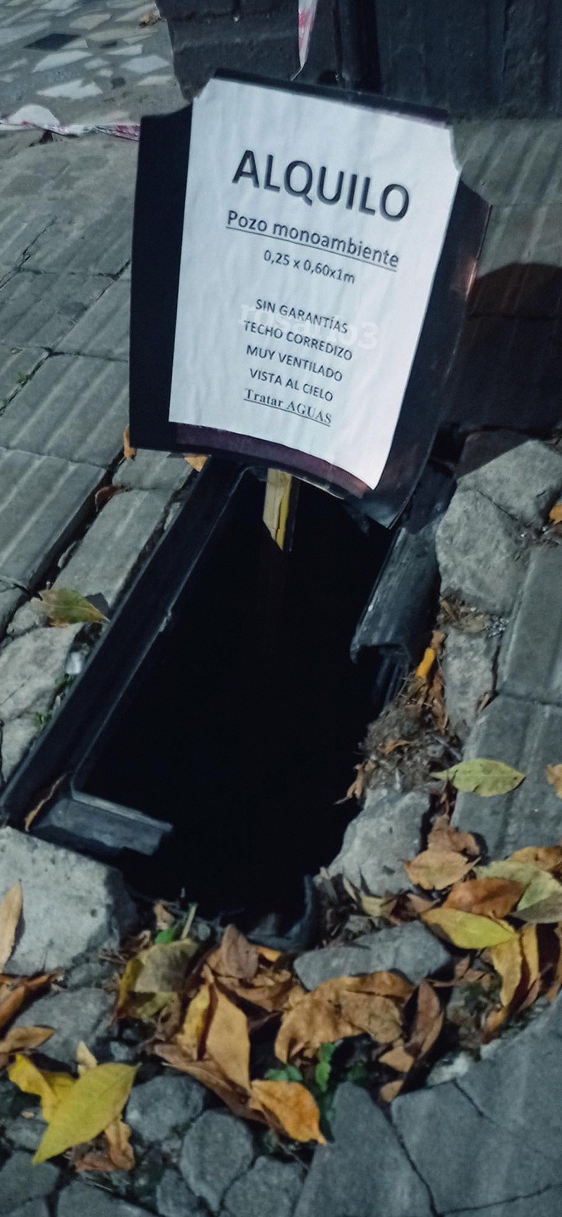 La imagen corresponde al usuario de Instagram @fernandoderme y fue viralizada por la cuenta @rosariolaciudad. "Pozo monoambiente: 0,25x0,60x1m", describe el cartel impreso, ubicado por los vecinos en la boca del hueco, en la vereda de la calle 9 de Julio.
