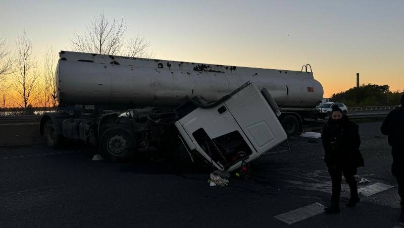 Sobre la misma mano que va al sur, pero más cerca del acceso a Rosario por avenida Belgrano (a la altura de Ayolas), un camión cisterna que iba en sentido contrario se chocó el guardarrail, se cruzó de carril y quedó con la cabina destruida y parte del chasis afectado. En declaraciones a Antes de Salir (El Tres), el conductor del vehículo de carga aseguró que lo había dejado estacionado frente a la comisaría 25ª de Villa Gobernador Gálvez y a las 5 de la mañana lo llamaron para avisarle que se lo habían robado y chocado. Finalmente trascendió que en realidad él mismo protagonizó el siniestro y luego abandonó el lugar.