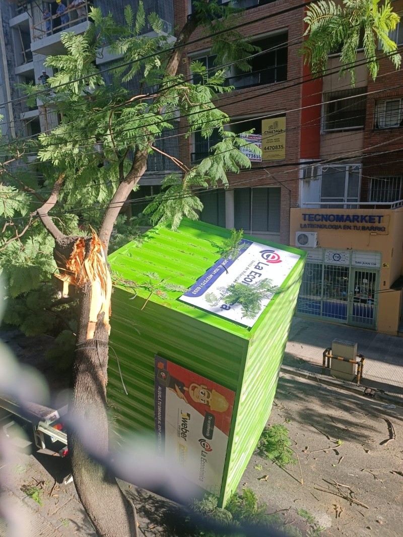 Vecinos de San Juan al 500 amanecieron con un fuerte estruendo este martes por la mañana. Al asomarse a la calle, se encontraron con un contenedor volcado sobre la calzada y un árbol completamente destruido.