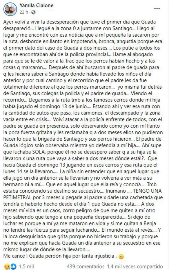 “Ayer volví a vivir la desesperación que tuve el primer día que Guada desapareció”, expresó el lunes a través de un posteo en Facebook la madre de la menor de cinco años, Yamila Cialone. “Llegué a la zona cero y me encontré con la noticia de que a mi pequeña la sacaron por la ruta, desbordé en llanto y en impotencia, bronca, angustia porque era el primer dato del caso de Guada después de dos meses”, agregó.