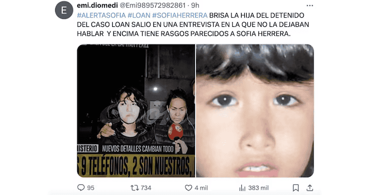 Uno de los usuarios comentó: “La hija del comisario detenido por Loan es igual a Sofía Herrera. El parecido es demasiado”. Sofía Herrera es una niña que desapareció en un camping cerca de Río Grande, Tierra del Fuego, el 28 de septiembre de 2008, y cuyo paradero sigue siendo un misterio.