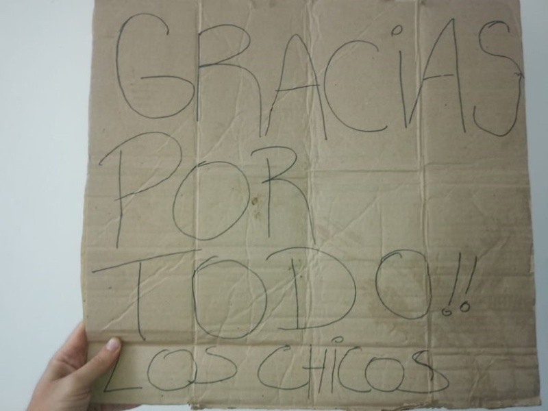 Rama bajó a la vereda y levantó el cartón con un mensaje: “Gracias por todo!” y una firma: “Los chicos”.