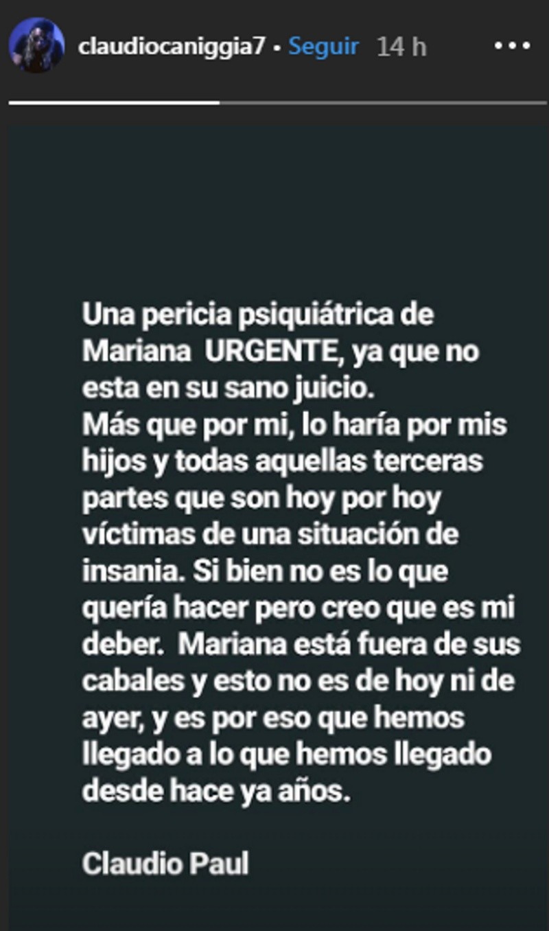 "Una pericia psiquiátrica de Mariana URGENTE, ya que no está en su sano juicio. Más que por mí, lo haría por mis hijos y todas aquellas terceras partes que son hoy por hoy víctimas de una situación de insania. Si bien no es lo que quería hacer pero creo que es mi deber. Mariana está fuera de sus cabales y esto no es de hoy ni de ayer, y es por eso que hemos llegado a lo que hemos llegado desde hace ya años. Claudio Paul”, escribió Caniggia este domingo por la noche en una historia de Instagram.