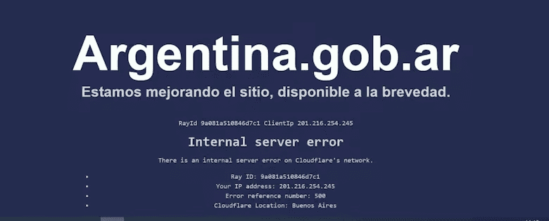 El sitio oficial del gobierno argentino también presentó fallas bajo el mensaje: "Internal server error. There is an internal server error on Cloudflare’s network“.