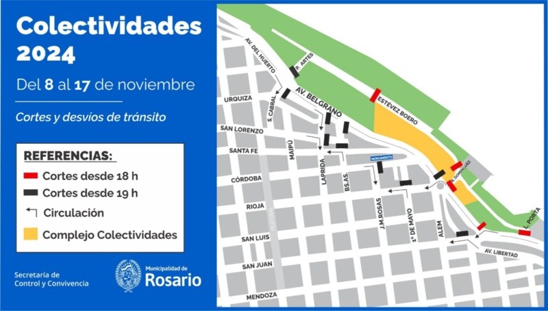 La Municipalidad organizó un esquema especial de transporte para Colectividades, que consiste en horarios y paradas estratégicas en inmediaciones del acceso principal para quienes asistan a la fiesta de la ciudad utilizando el TUP. Todo el operativo incluye inspectores y refuerzos de líneas para facilitar llegada y retiro de las personas que asisten al evento. Este esquema funcionará de lunes a domingo desde las 20:00 y finalizará según los días en los siguientes horarios: domingos a jueves a la 01:00, viernes y sábados a las 02:00, en tanto el lunes 18 también concluirá a las 02:00. Las líneas que desviarán para llegar al predio de Fiesta Nacional de Colectividades: 106 Negra, 106 Roja, 102 Roja, 112 Negra, 112 Roja, 116, 121, 123, 127, 131, 132, 101 Negra, 110, 122 Roja, 122 Verde, 126 Negra, 126 Roja, 128 Negra, 128 Roja, 146 Roja, 146 Negra, 140, 142 Negra, 142 Roja, 143 136 137 Negra, 143 136 137 Roja, 145 133 Cabín 9, 145 133 Soldini, 130. Parada Av. Belgrano y Rioja Líneas 106 R/N, 112 R/N, 127, 128 R/N, 101 N, 110, 116, 122 R/V, 126 R/N, 130 y 140: De sus recorridos por calle Laprida, Córdoba, Av. Belgrano, Rioja, Laprida a sus recorridos. Líneas 146 R/N, 131 y 132: De sus recorridos por San Luis, Buenos Aires, Córdoba, Belgrano, Rioja, Juan M. Rosas a sus recorridos. Líneas 102 Roja: De su recorrido por calle Buenos Aires, Córdoba, Av. Belgrano, Rioja, Buenos Aires a su Recorrido. Líneas 142 R/N y 143 136 137 R/N: De su recorrido por San Luis, Buenos Aires, Córdoba, Belgrano, Rioja, Laprida a su recorrido. Línea 145 133 Soldini / Cabin 9: De su recorrido por calle San Luis, Buenos Aires, Córdoba, Belgrano, Rioja, Juan M. Rosas, Mendoza, L. N. Alem a su Recorrido. Parada Av. Libertad y Rioja Líneas 106 R/N, 112 R/N, 110, 116, 122 R/V, 140, 101 N y 142 R/N: De sus recorridos por calle Maipú, Mendoza, Ayacucho, Av. de la Libertad, Rotonda de Av. Belgrano y Raúl Domínguez, L. N. Alem, San Juan, Maipú a sus recorridos. Línea 121: De su recorrido por Mendoza, Ayacucho, Av. de la Libertad, Rotonda de Av. Belgrano y Raúl Domínguez, L. N. Alem, San Juan, Buenos Aires a su recorrido. Línea 123: De su recorrido por Mendoza, Ayacucho, Av. de la Libertad, Rotonda de Av. Belgrano y Raúl Domínguez, L. N. Alem, San Juan a su recorrido. Línea 146 R/N: De su recorrido por calle Ayacucho, Av. de la Libertad, Rotonda de Av. Belgrano y Raúl Domínguez, L. N. Alem, San Juan, Maipú a su recorrido. Líneas 131 y 132: De sus recorridos por Necochea, Av. de la Libertad, Rotonda de Av. Belgrano y Raúl Domínguez, L. N. Alem, San Juan a sus recorridos. Líneas 145 133 Soldini / Cabin 9: de su recorrido por Ayacucho, Av. de la Libertad, Rotonda de Av. Belgrano y Raúl Domínguez, L. N. Alem, 3 de febrero a su recorrido. Líneas 143 136 137 R/N: De su recorrido por Buenos Aires, Mendoza, Ayacucho, Av. de la Libertad, Rotonda de Av. Belgrano y Raúl Domínguez, L. N. Alem, San Juan a recorrido. Línea 102 Roja: De su recorrido por Mendoza, Ayacucho, Av. de la Libertad, Rotonda de Av. Belgrano y Raúl Domínguez, L. N. Alem a su recorrido. 40 años celebrando lo que nos hace únicos ���� • Laprida y Córdoba (106 R/N, 112 R/N, 127, 128 R/N, 101 N, 110, 116, 126 R/N, 140, 122 R/V y 130) • Maipú y San Juan (106 R/N, 112 R/N, 110, 116, 122 R/V, 140, 101 N, 142 R/N y 146 R/N) Permanece habilitada para la línea 115 ambas banderas • 3 de Febrero y L. N. Alem (146 R/N) Permanece habilitada para las líneas 102R, K y Q • 3 de Febrero y Juan Manuel de Rosas (146 R/N) Permanece habilitada para la línea 102R • 3 de Febrero y Laprida (Línea 146 R/N) • San Luis y Buenos Aires (Líneas 146 R/N y 145 133 Soldini / Cabin 9)) • San Luis y J. M. Rosas (Líneas 145 133 Soldini / Cabin 9, 131 y 132 ) Permanece habilitada para las líneas 115 y 145 133 Soldini / Cabin 9 • San Luis y 1ro de Mayo (145 133 C9 / Soldini) Permanece habilitada para la línea 115 ambas banderas • L. N. Alem y Mendoza (145 133 C9 / Soldini) Permanece habilitada para la línea 115 ambas banderas • Buenos Aires y Rioja (102 R, 121 y 145 133 Soldini / Cabin 9) • Buenos Aires y San Juan (121) • Maipú y San Luis (106 R/N, 112 R/N, 110, 116, 140, 101 N, 142 R/N, 146 R/N, 122 R/V) • Laprida y Santa Fe (106 R/N, 112R/N, 127, 128R/N, 101N, 110, 116, 126R/N, 140, 122 R/V, y 130) • Av. de la Libertad y Rioja (106 R/N, 112 R/N, 110, 140, 101 N, 116, 122 R/V, 142 R/N, 121,123, 130, 131, 132, 145 133 C9 Y Soldini, 143 136 137 R/N, 102 R y 146 R/N) • Av. Belgrano y Rioja (106 R/N, 112 R/N, 110, 140, 101 N, 116, 122 R/V, 142 R/N, 127, 126 R/N, 128 R/N, 131, 132, 145 133 C9 Y Soldini, 143 136 137 R/N y 146 R/N) • Mendoza y Buenos Aires (106 R/N, 112 R/N, 110, 140, 101N, 142 R/N, 116 y 122 R/V) • Mendoza y L. N. Alem ((145 133/ C9/ Soldini) • Juan Manuel de Rosas y San Juan (131, 132 y 145 133 C9/ Soldini) • San Juan y Buenos Aires (Línea 121) • San Juan y Laprida (Línea 146 R/N) • San Juan y Juan Manuel de Rosas (Línea 146 R/N) Por su parte, desde la Secretaría de Control y Convivencia confirmaron la presencia a lo largo de todas las jornadas de personal municipal que desarrollará tareas de fiscalización de la venta ambulante en la zona, garantizará el respeto de los horarios estipulados, el ingreso y egreso fluido de la gente, una estancia tranquila en el predio y, además, controlará especialmente el tránsito en los alrededores tal como se viene llevando adelante cada año. Para tal fin, se dispuso una serie de cortes de tránsito y, además, el ordenamiento del estacionamiento a lo largo de todo el encuentro. En este sentido, para los autos particulares se destinan dos zonas de estacionamiento, ambas ubicadas por Av. Belgrano. Hacia el sur: desde Canal 5 hasta Av. Pellegrini. Hacia el norte: desde calle Buenos Aires hasta la ex Aduana. El estacionamiento tendrá un bono contribución para colaborar con la Cooperadora del Hospital Alberdi. Costo $ 2.000. A su vez, las i