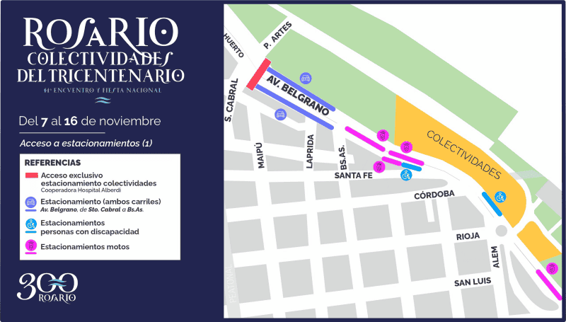El esquema vehicular contempla cortes programados y una organización específica del estacionamiento. Para los vehículos particulares habrá dos sectores habilitados sobre avenida Belgrano: hacia el sur, desde San Juan hasta Pellegrini, y hacia el norte, desde el predio de Colectividades hasta la bajada Sargento Cabral, en el área de la ex Aduana.