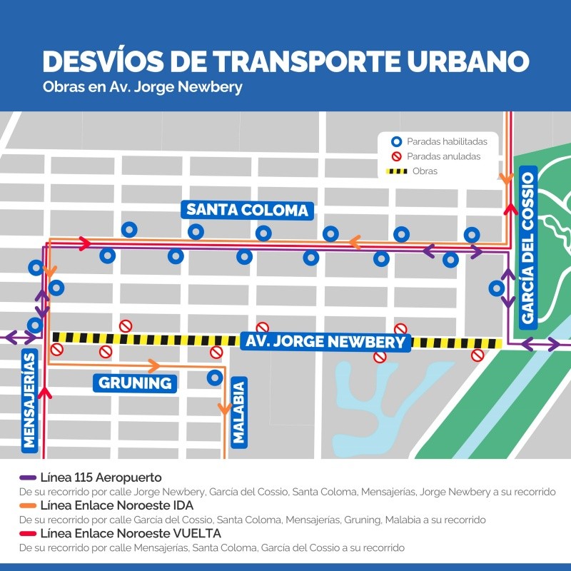 Debido a la ejecución de los trabajos mencionados, algunas líneas del transporte urbano deberán modificar sus recorridos habituales así como sus paradas de ascenso y descenso de pasajeros de forma temporal. Línea 115 Aeropuerto: de su recorrido por calle Jorge Newbery, García del Cossio, Santa Coloma, Mensajerías, Jorge Newbery a su recorrido. Línea Enlace Noroeste: Ida: de su recorrido por calle García del Cossio, Santa Coloma, Gruning, Malabia a su recorrido. Vuelta: de su recorrido por calle Mensajerías, Santa Coloma, García del Cossio a su recorrido. Línea 115 Aeropuerto Línea Enlace Noroeste Paradas anuladas: La segunda etapa de la reconstrucción integral de la Av. Jorge Newbery comprende la ejecución de una arteria de pavimento definitivo de dos calzadas y cantero central en el tramo de Av. Newbery, que luego conecta con Av. A. J. Paz, entre la calle González del Solar y la rotonda de Av. Real, frente al Aeropuerto Internacional Islas Malvinas. Los trabajos se realizan en un tramo de 4.420 metros y empalman con la primera etapa de la reconstrucción de 1.300 metros de la traza (finalizada a principios de 2022), entre la avenida Circunvalación y la calle Wilde. El proyecto incluye ciclovías, ejecución de cordón cuneta, desagües pluviales y eliminación de zanjas, entre otras intervenciones. Asimismo, comprende la ejecución de un nuevo puente sobre el Arroyo Ludueña, y abarca la incorporación de nueva semaforización, iluminación LED, colocación de señalización, tareas de parquización, y accesos vehiculares. La remodelación propone poner en valor la zona, y también implica tareas de saneamiento ambiental, que dotarán de infraestructura al barrio y que mejorarán la calidad de vida de los vecinos y vecinas del barrio. Además, en conjunto y complemento con la primera etapa de la obra que comprendió el sector de Wilde a Circunvalación, esta segunda etapa mejorará la conexión vial y conectividad entre el este y oeste de la ciudad, optimizando la circulación y los tiempos de desplazamiento hacia el Aeropuerto, el Autódromo Municipal y las localidades vecinas de Funes y Roldán. La obra está incluida en el marco del Acuerdo Rosario, que comprende 10 obras fundamentales para la ciudad que se llevarán adelante con financiamiento provincial, consensuadas y priorizadas entre Provincia y Municipio.Nuevas paradas habilitadas:
