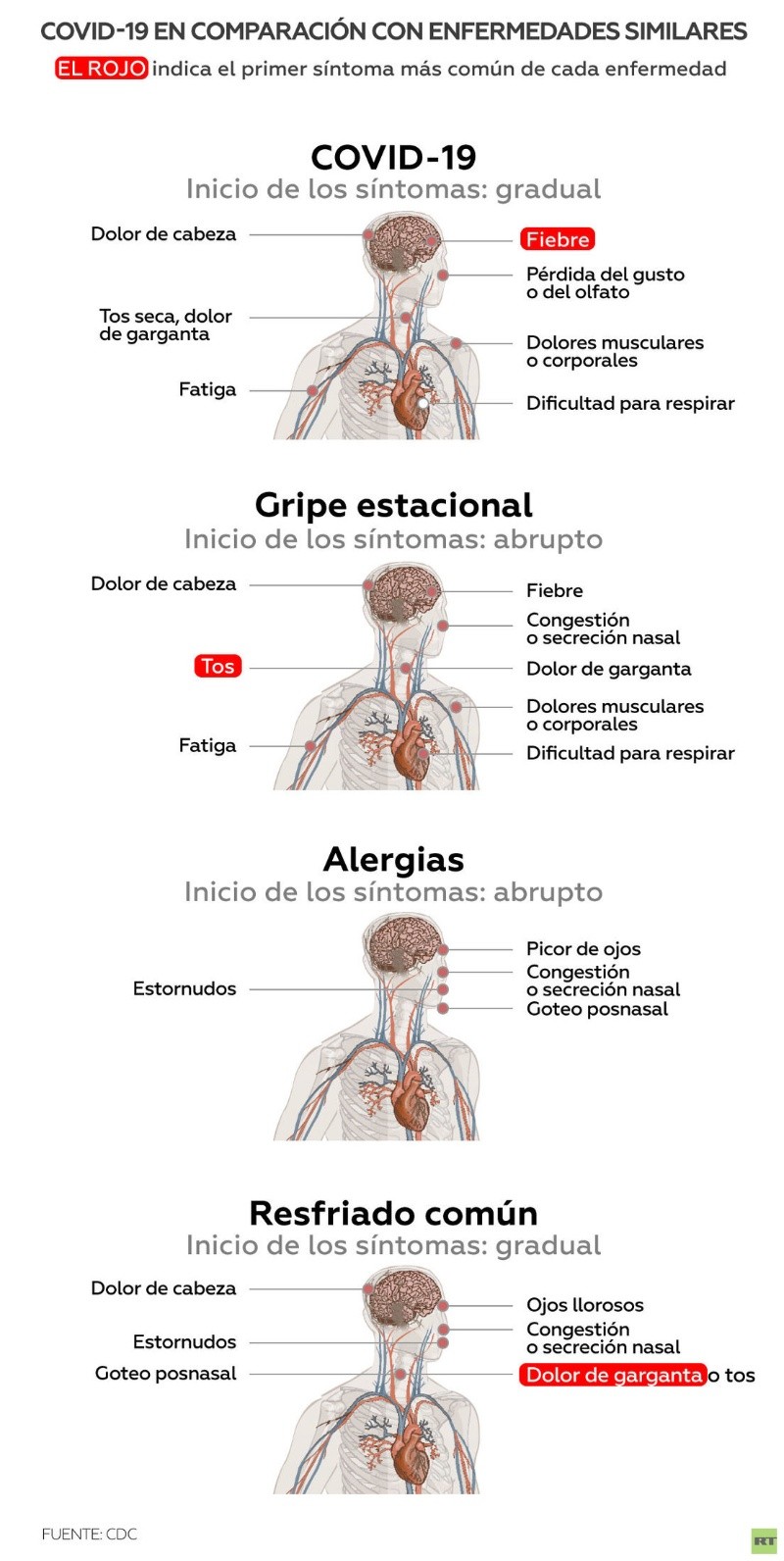 En la siguiente infografía creada por RT, se enumeran los síntomas de diferentes enfermedades: el covid-19, la gripe estacional, el resfriado común y las alergias. No obstante, cabe mencionar que estas listas de síntomas, así como el orden en que aparecen, no son infalibles.
