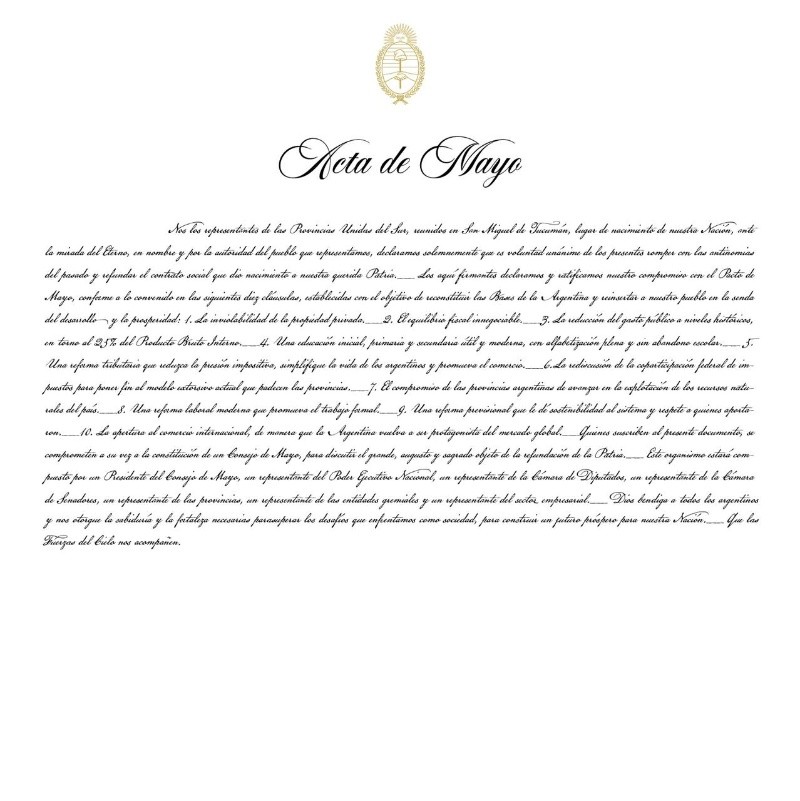 La transcripción completa del Acta de Mayo "Nos los representantes de las Provincias Unidas del Sur, reunidos en San Miguel de Tucumán, lugar de nacimiento de nuestra Nación, ante la mirada del Eterno, en nombre y por la autoridad del pueblo que representamos, declaramos solemnemente que es voluntad unánime de los presentes romper con las antinomias del pasado y refundar el contrato social que dio nacimiento a nuestra querida Patria. Los aquí firmantes declaramos y ratificamos nuestro compromiso con el Pacto de Mayo, conforme a lo convenido en las siguientes diez cláusulas, establecidas con el objetivo de reconstituir las Bases de la Argentina y reinsertar a nuestro pueblo en la senda del desarrollo y la prosperidad: 1. La inviolabilidad de la propiedad privada. 2. El equilibrio fiscal innegociable. 3. La reducción del gasto público a niveles históricos, en torno al 25% del Producto Bruto Interno. 4. Una educación inicial, primaria y secundaria útil y moderna, con alfabetización plena y sin abandono escolar. 5. Una reforma tributaria que reduzca la presión impositiva, simplifique la vida de los argentinos y promueva el comercio. 6. La rediscusión de la coparticipación federal de impuestos para terminar para poner fin al modelo extorsivo actual que padecen las provincias. 7. El compromiso de las provincias argentinas de avanzar en la explotación de los recursos naturales del país. 8. Una reforma laboral moderna que promueva el trabajo formal. 9. Una reforma previsional que le dé sostenibilidad al sistema y respete a quienes aportaron. 10. La apertura al comercio internacional, de manera que la Argentina vuelva a ser protagonista del mercado global. Quienes suscriben al presente documento, se comprometen a su vez a la constitución de un Consejo de Mayo, para discutir el grande, augusto y sagrado objeto de la refundación de la Patria. Este organismo estará compuesto por un Presidente del Consejo de Mayo, por un representante del Poder Ejecutivo Nacional, un representante de la Cámara de Diputados, un representante de la Cámara de Senadores, un representante de las provincias, un representante de las entidades gremiales y un representante del sector empresarial. Dios bendiga a todos los argentinos y nos otorgue la sabiduría y la fortaleza necesarias para superar los desafíos que enfrentamos como sociedad, para construir un futuro próspero para nuestra Nación. Que las Fuerzas del Cielo nos acompañen".