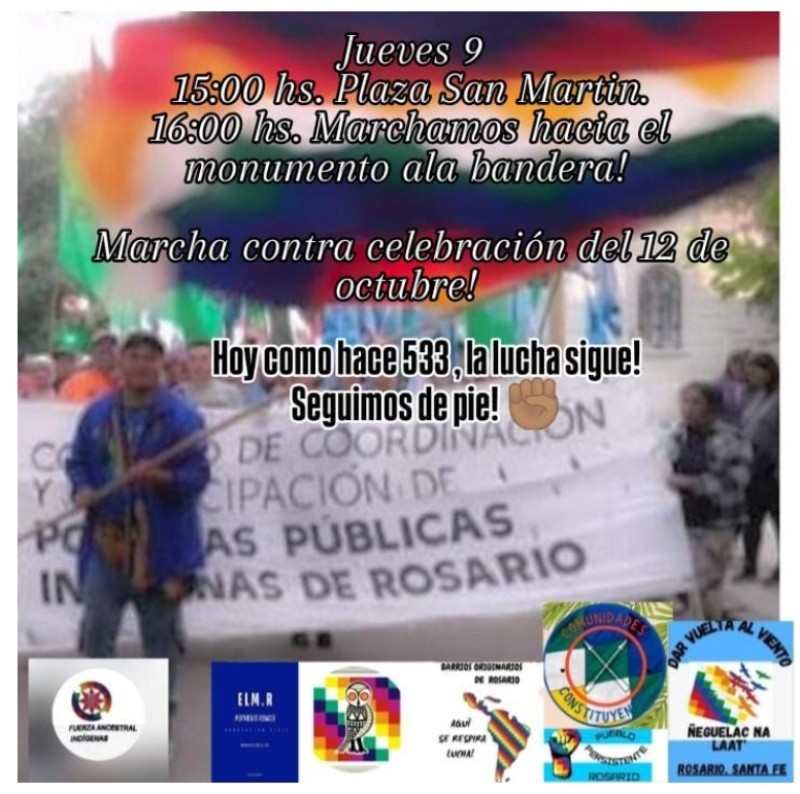 En vísperas del Día del Respeto a la Diversidad Cultural que se conmemora este 12 de octubre pero con el feriado adelantado al viernes 10, las comunidades originarias que habitan la ciudad de Rosario convocan a una manifestación pública que denominan “Resistencia Indígena”. Tendrá lugar este jueves 9 de octubre, a las 15, en la plaza San Martín.