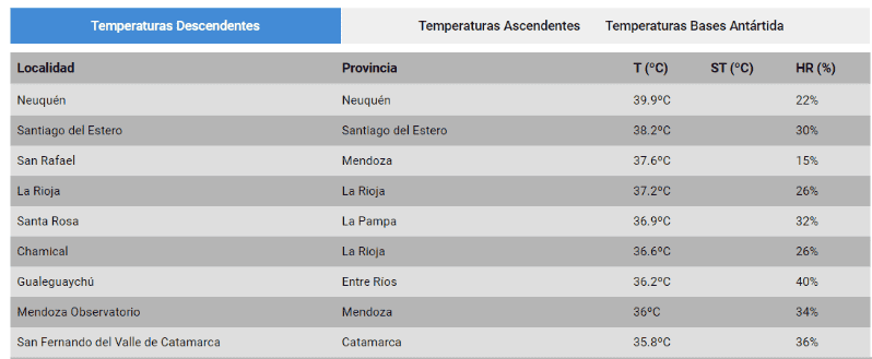 Santiago del Estero, con 38,2, y San Rafael de Mendoza, con 37,6, completaban el podio de las localidades más calientes de la jornada.