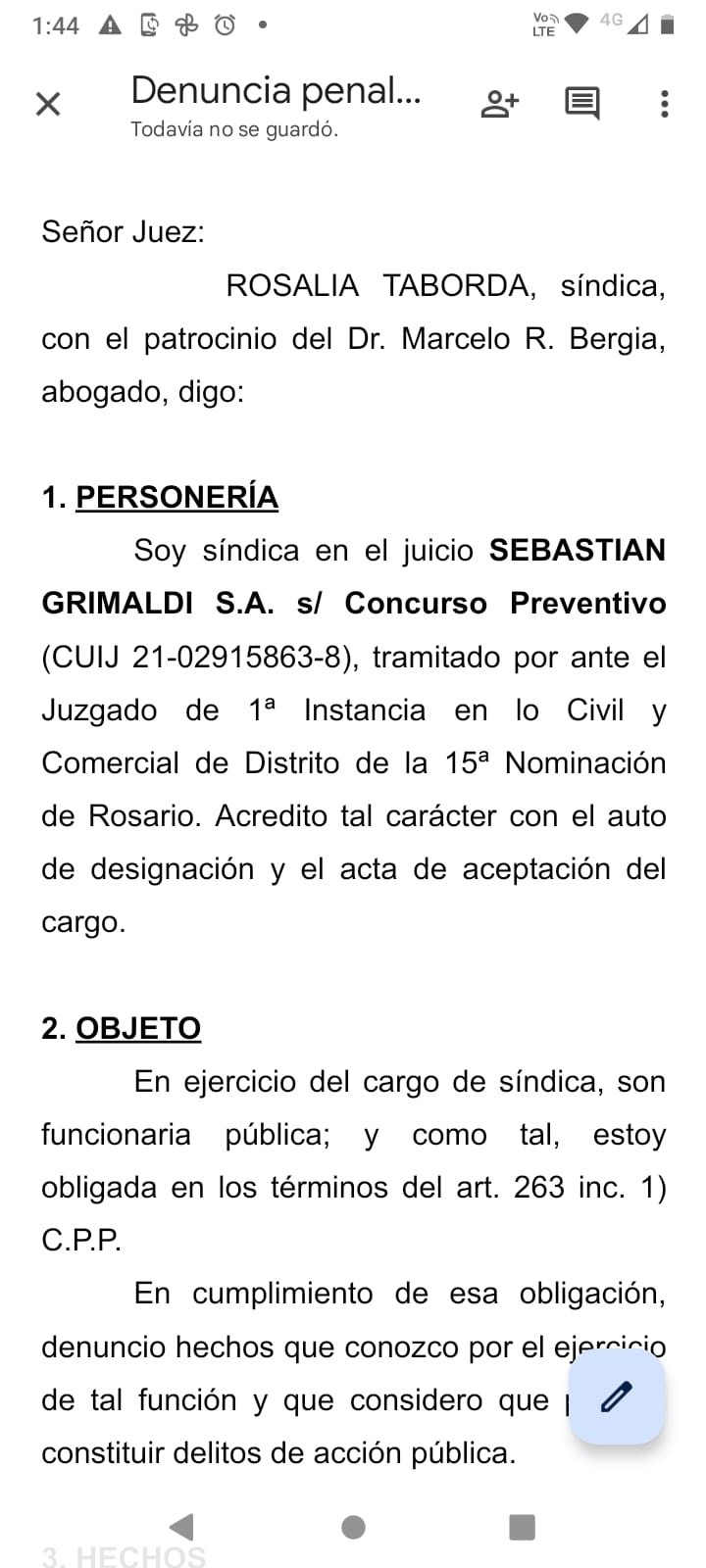 Con el hallazgo documentado de los fiscales que persiguen delitos económicos, la situación de Grimaldi -ya imputado- se complica. Y como si eso fuera poco, esa semana la síndica del concurso de la cerealera Sebastián Grimaldi SA, Rosalía Taborda, denunció penalmente al titular de la empresa.